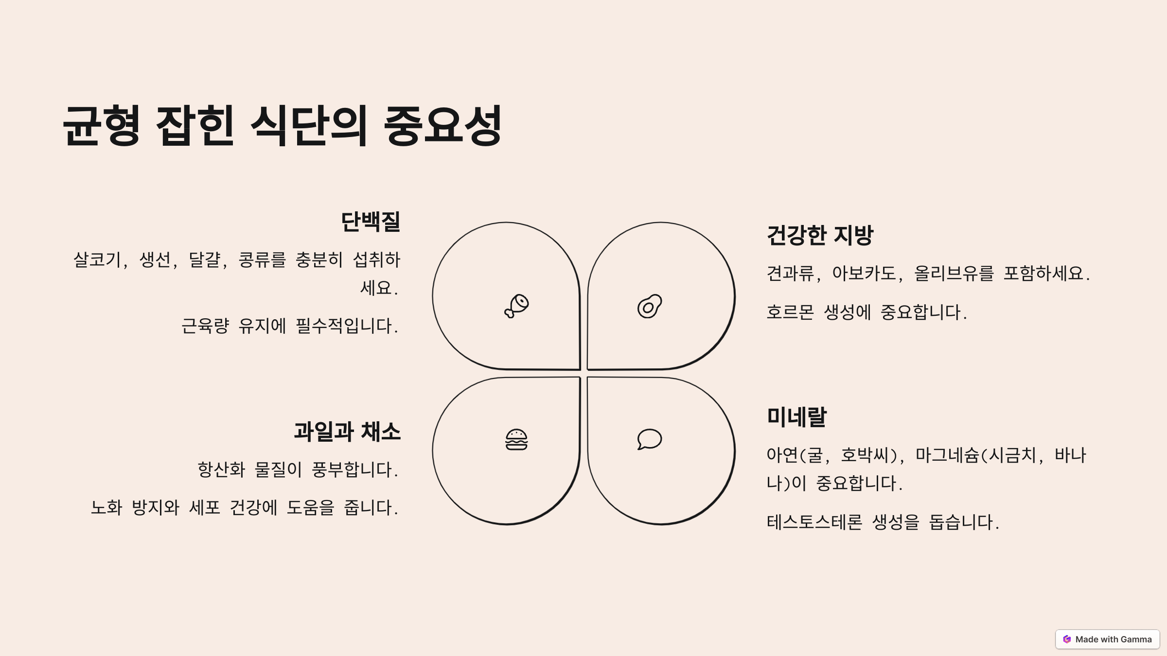 | 피로, 근력 저하, 성욕 감소 | 운동과 영양 관리 | 규칙적인 수면과 스트레스 관리 |