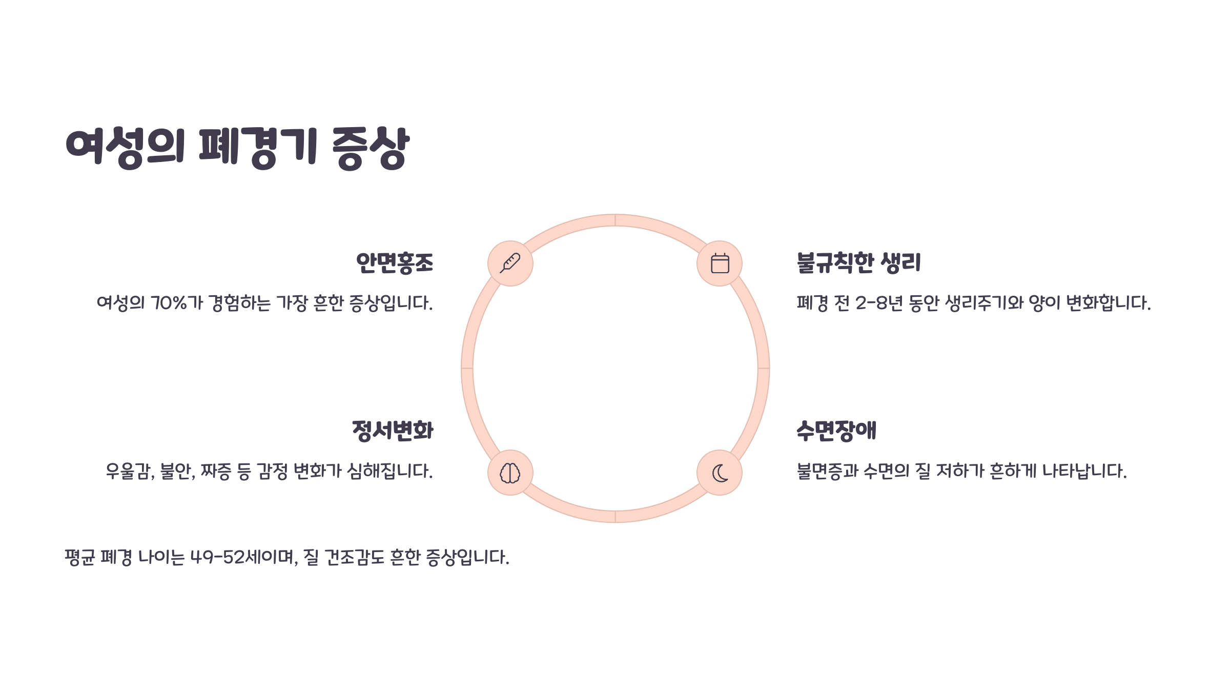| 중년기 호르몬 변화 | 폐경과 남성 갱년기로 에스트로겐, 테스토스테론 수치가 급감 |