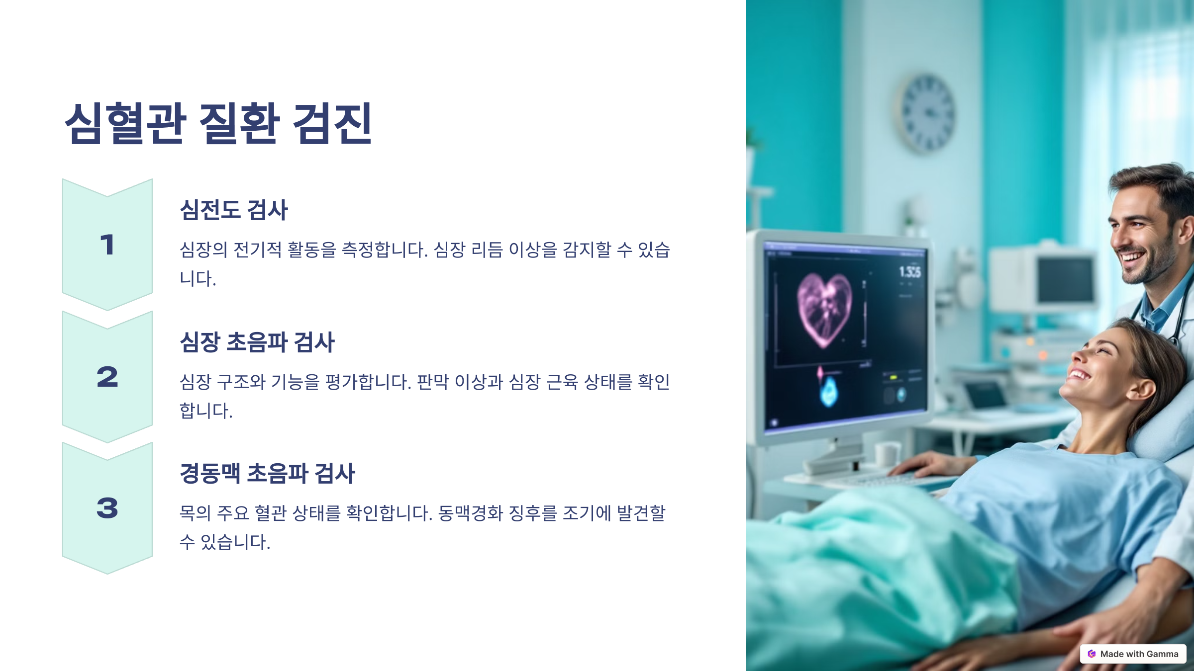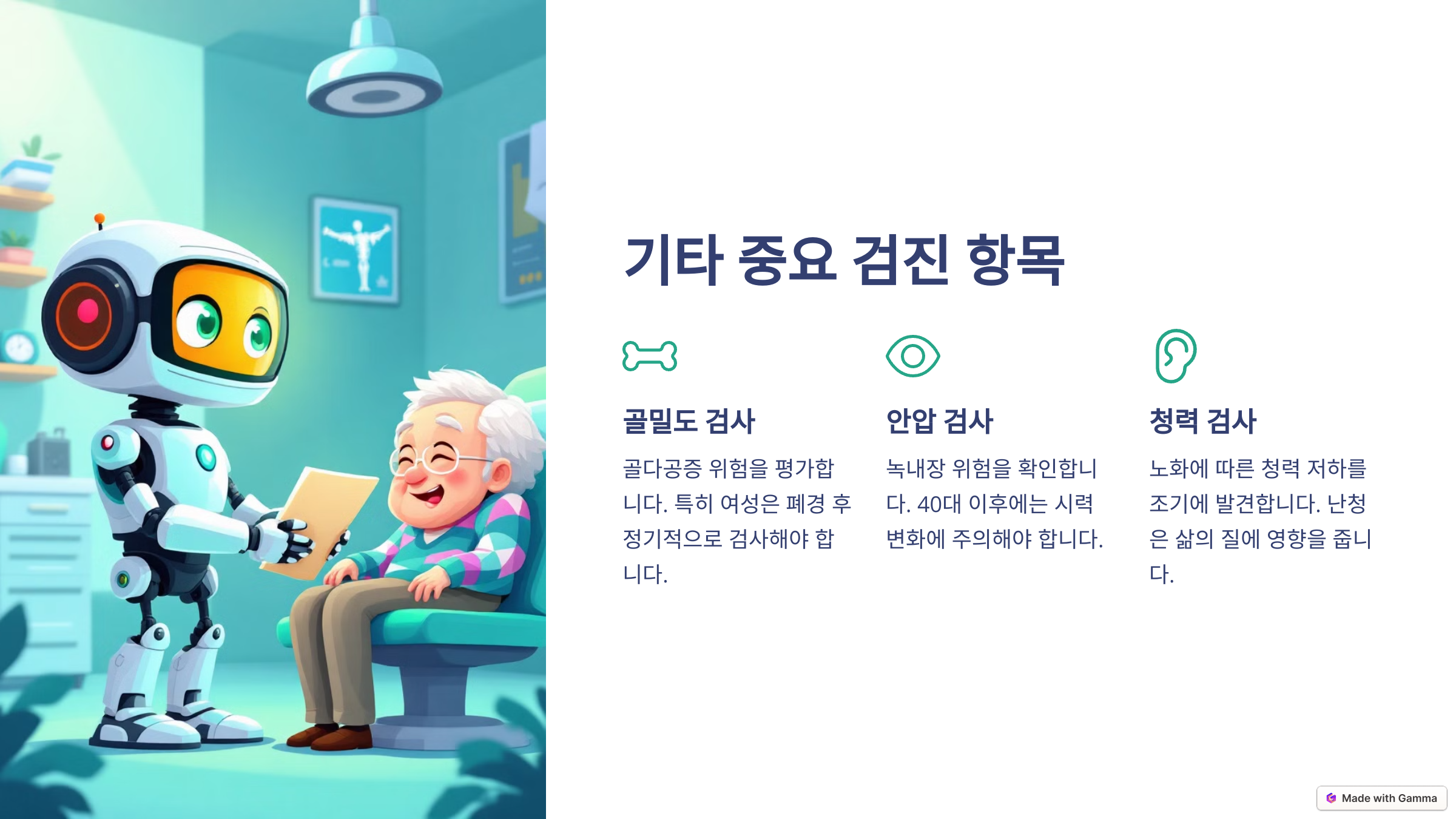 기본적인 혈압 검사, 혈당 검사, 혈액 검사는 매년 또는 2년마다 시행하는 것이 좋으며, 심혈관 질환 예방을 위한 심전도 검사, 경동맥 초음파 검사도 필요합니다. 또한 골밀도 검사, 안압 검사, 청력 검사와 같은 노화 관련 검진도 놓치지 말아야 합니다.