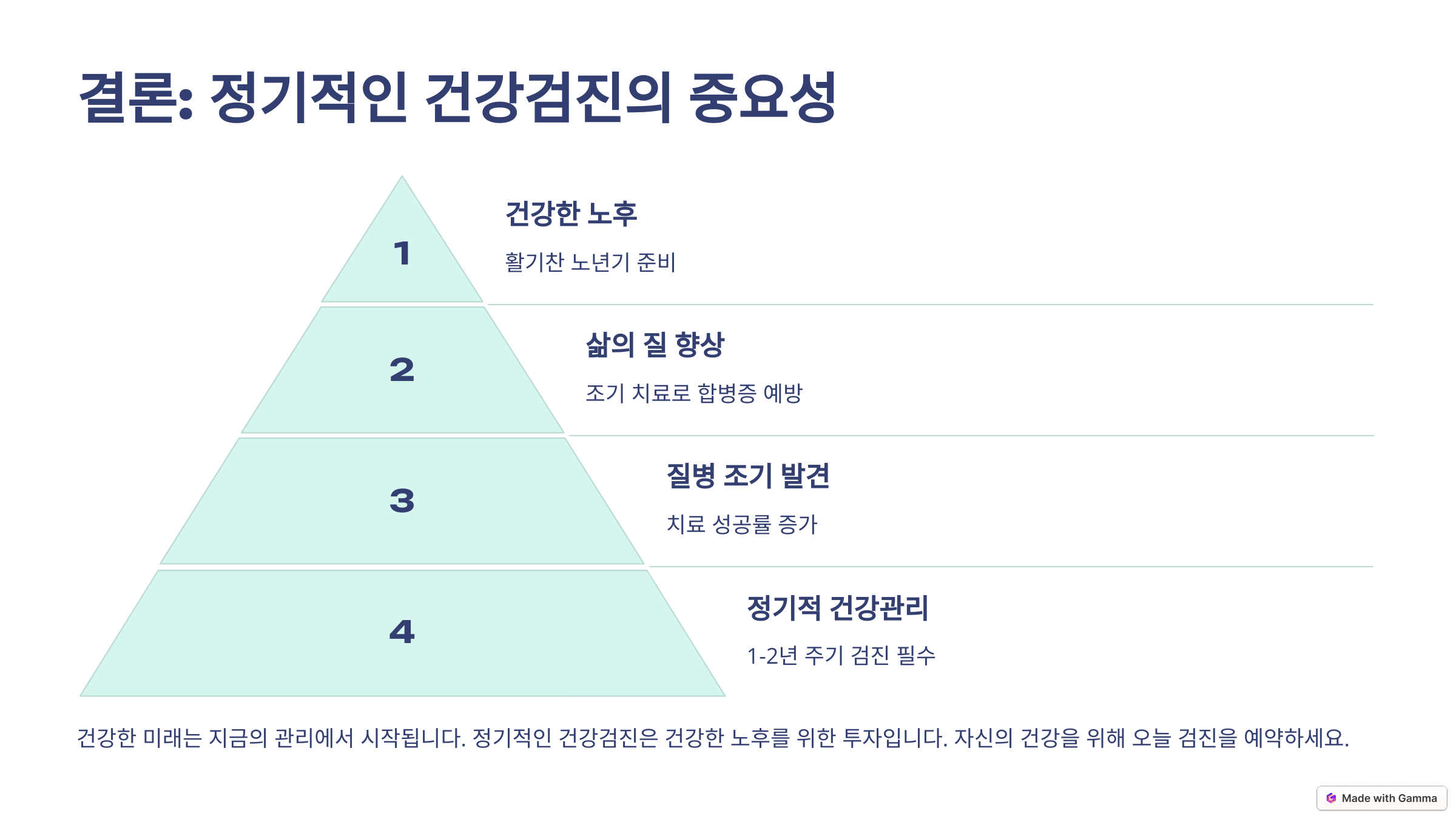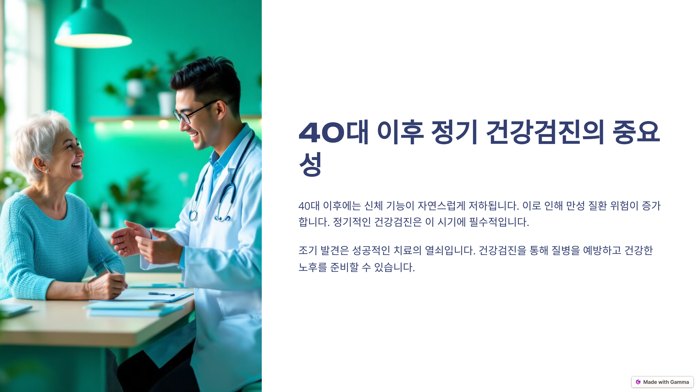 40대 이후 건강 관리는 선택이 아니라 필수입니다. 정기적인 건강검진을 통해 내 몸 상태를 점검하고, 조기에 질병을 발견하여 예방하는 것이 중요합니다. 검진을 미루지 말고, 지금 바로 건강을 위한 첫 걸음을 내딛어 보세요!
